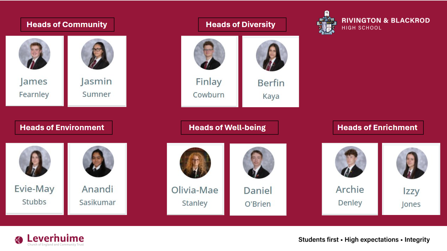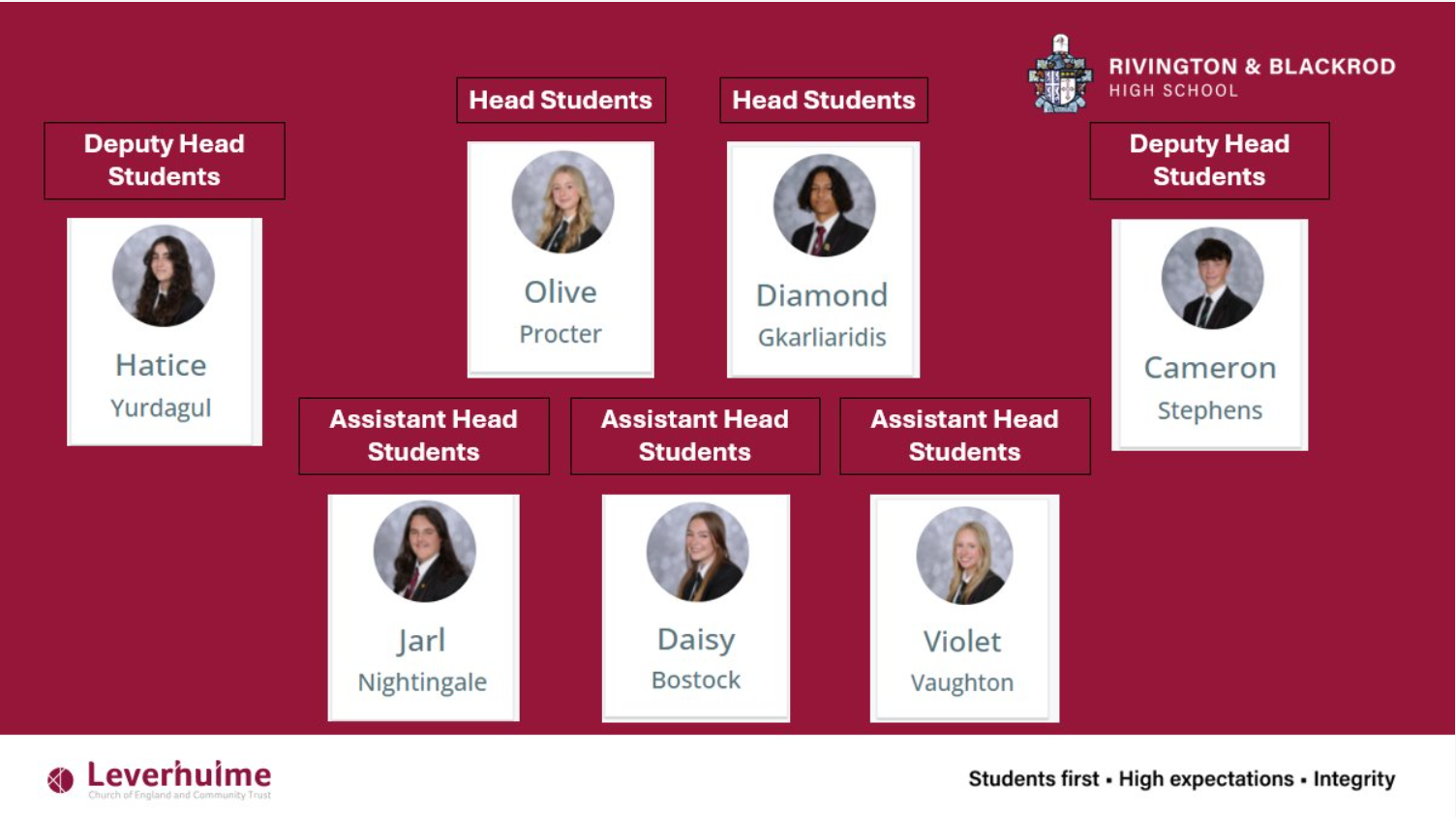 Our student leadership team and prefects are an essential aspect of our students having a voice at Rivington and Blackrod High School. The process can start from Yr7 and continue until Yr 10. They can nominate themselves to become form reps. Each form rep will have opportunities to discuss and be part of how we can improve the school journey for each student. The prefect application process starts in the summer term of Year 10. Students have to apply to become a prefect, we have well over half of the year apply for these positions each year.
