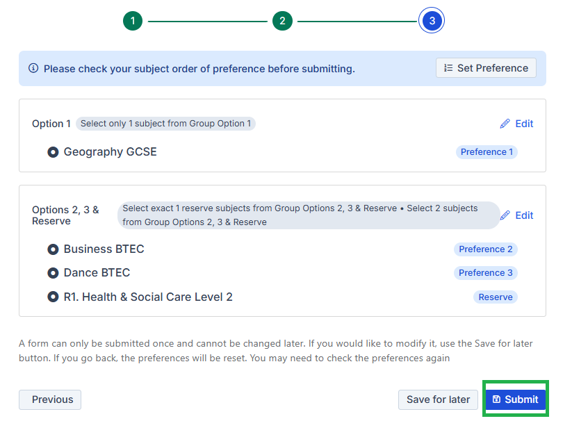 A form can only be submitted once and cannot be changed later. If you would like to modify it, use the Save for later button. If you go back, the preferences will be reset. You may need to check the preferences again